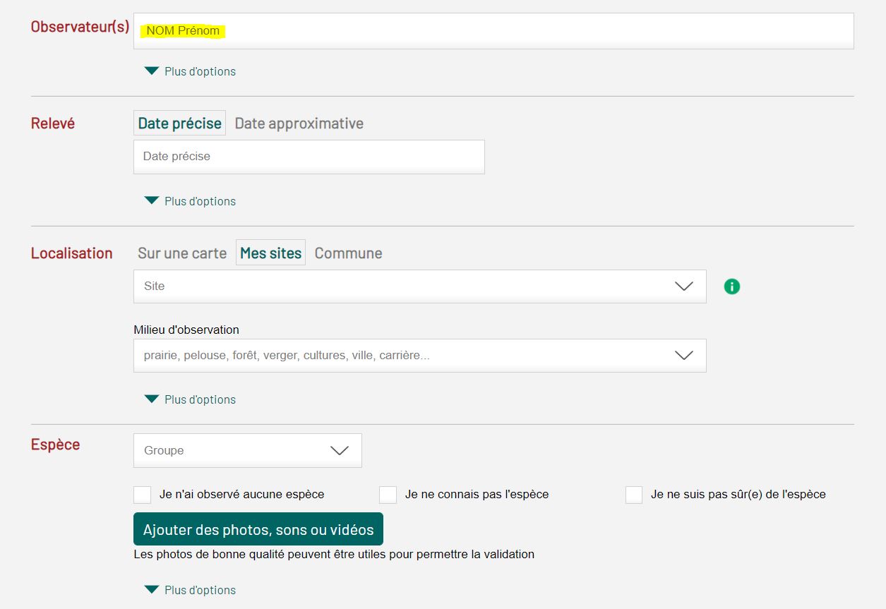 Saisissez ici la ou les personnes ayant observé l’espèce (ou entendu, ou relevé sa trace, ou un autre indice, etc…). Respectez le format NOM en majuscule et Prénom en minuscule sauf pour la 1ère lettre.