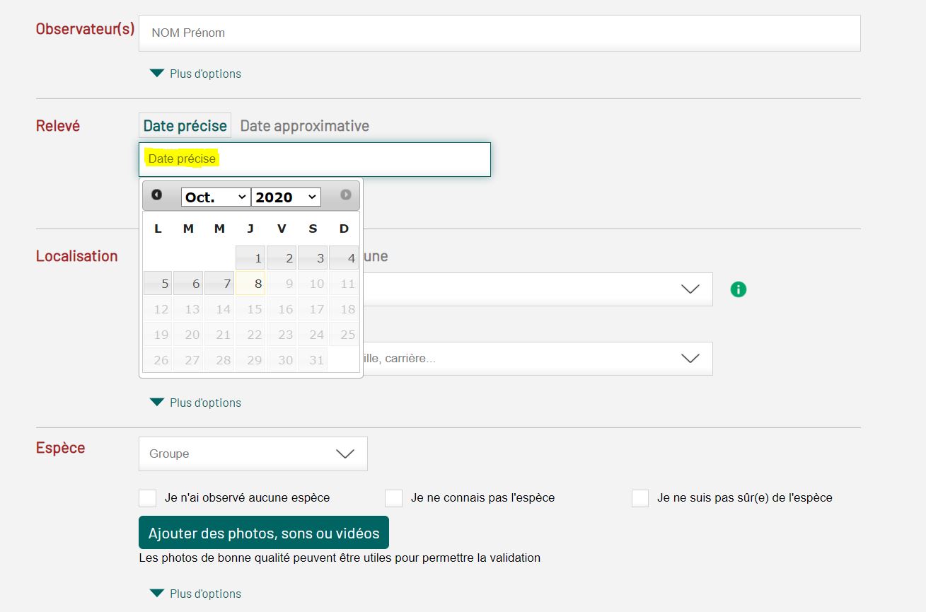 Inscrivez ici la date à laquelle vous avez réalisé votre observation. Pour cela, utilisez le calendrier qui apparait lorsque vous cliquez sur le champ "Date précise".