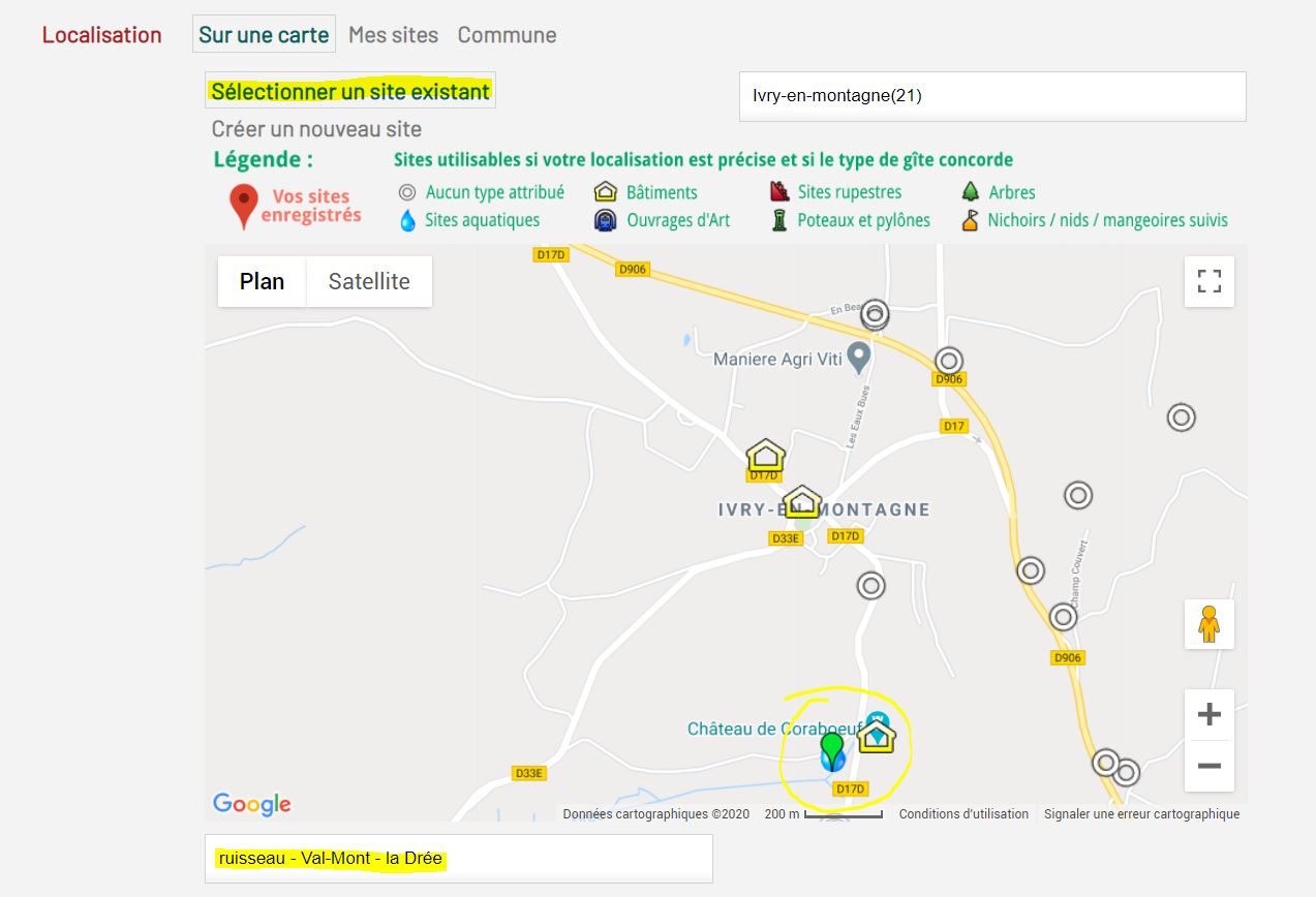 3a· "Sélectionner un site existant" : il faut zoomer pour faire apparaitre toutes les localisations existantes. Les icônes diffèrent selon le type de biotope du site concerné. Reportez-vous à la légende pour en connaitre la signification. En cliquant sur un site existant, les informations le concernant apparaissent en dessous de la carte : Commune / Département / Lieu dit / Type de biotope (lorsque l’info est disponible pour les 2 derniers). Le site sélectionné est celui qui apparait sous la carte.