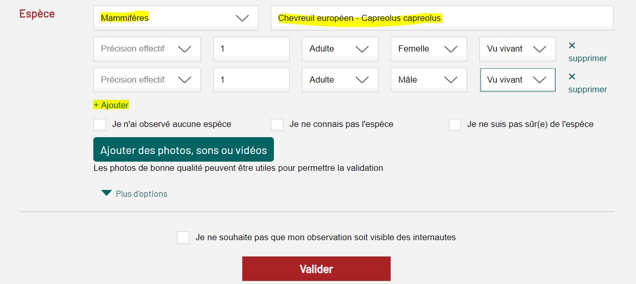 Note : vous n’êtes pas obligé de remplir systématiquement les 4 champs ensemble. Si vous n’avez pas l’information concernant l’un de ces champs, ne le remplissez pas. Par exemple : 4 / Juvénile / / Vu vivant, ou 2 / / Mâle, ou 10 / / / Entendu.