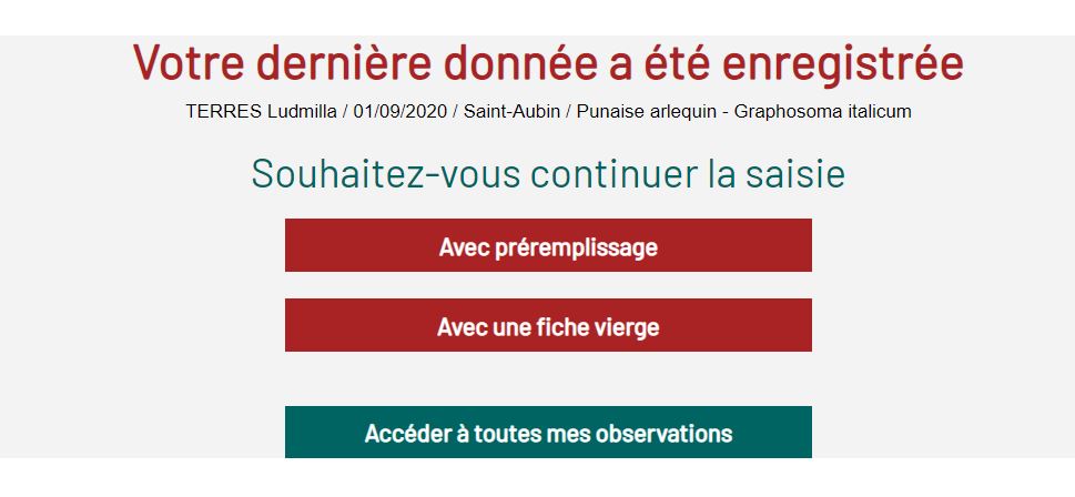 Une fois votre donnée validée, un message vous confirme son enregistrement, en rappelant les informations qui la constitue : Observateur / Date / Commune / Espèce.